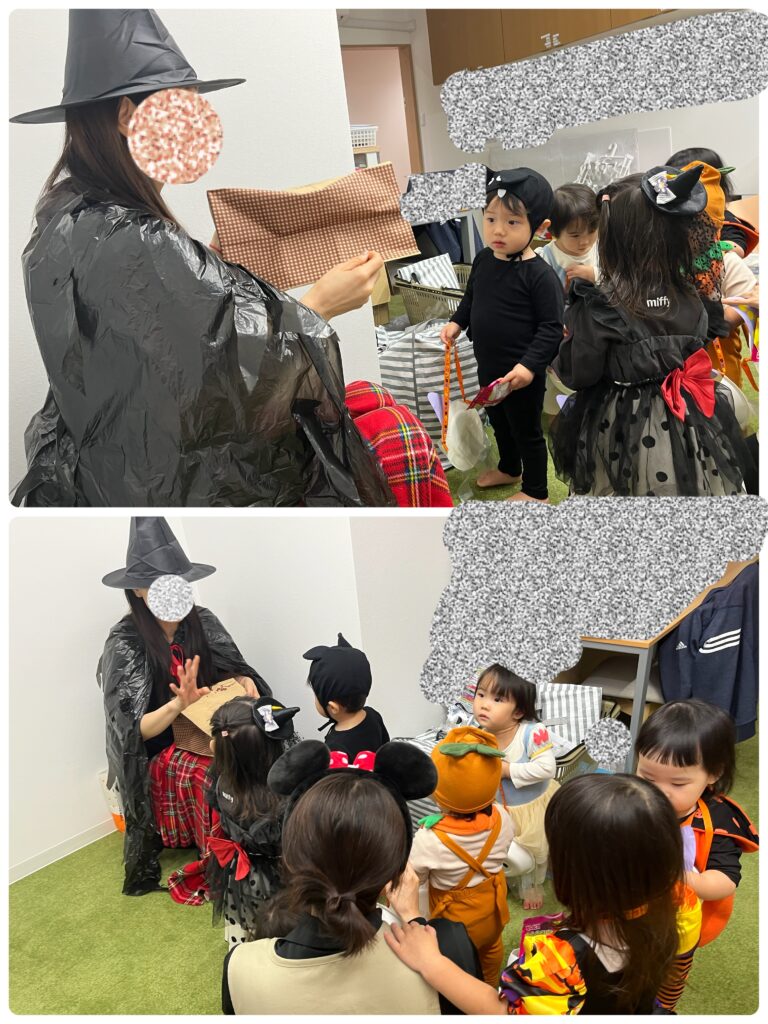 さぁ園内を探してお菓子をもらおう‼️誰が隠れているかな?魔女🧙♀️🧹や猫🐈⬛を見つけてお菓子をもらったけれど、そら組さんはいつもと違う様子を敏感に感じ、ちょっと怖くて涙が出ちゃう子もいましたね😭。